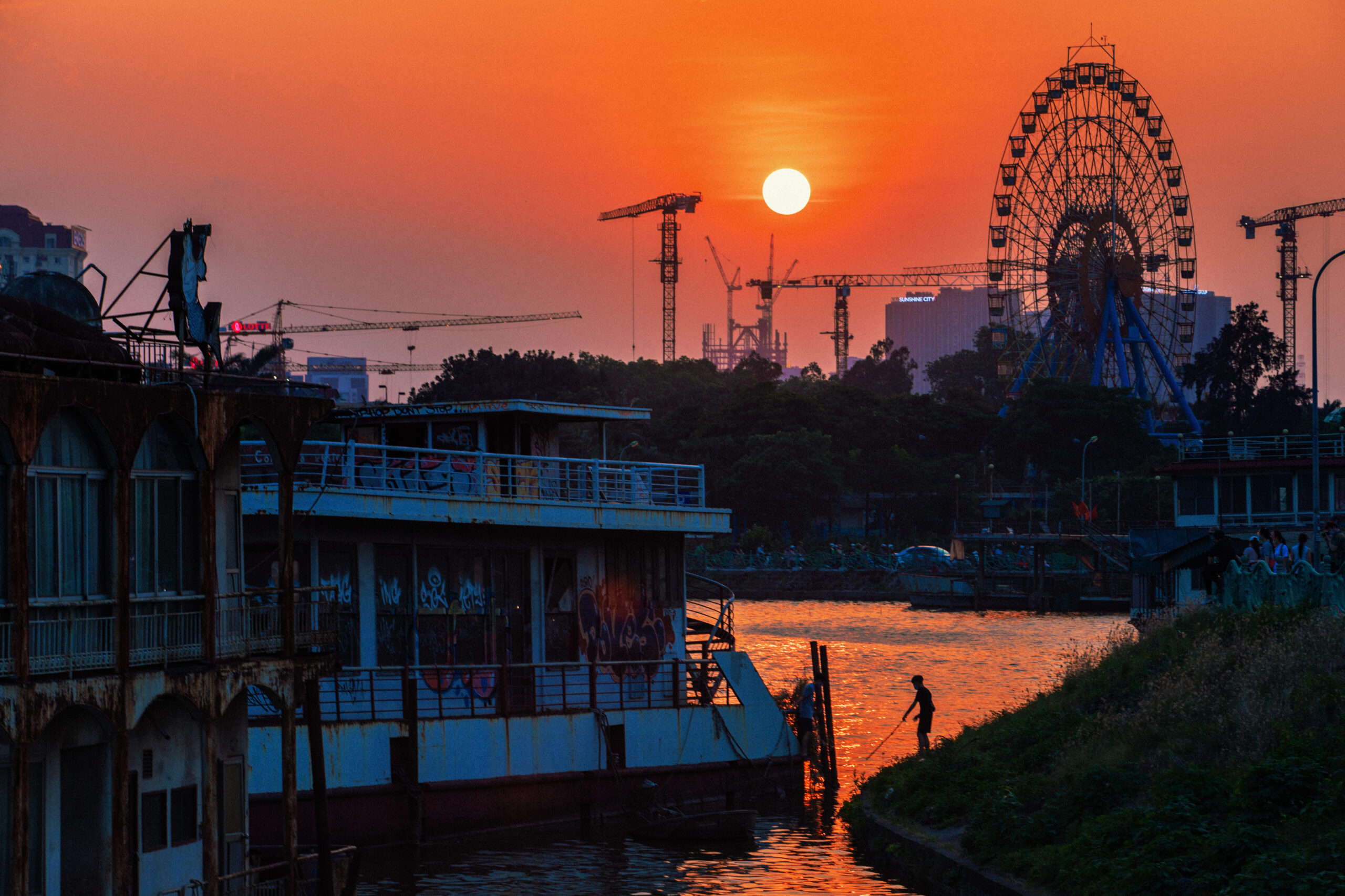 PICTURE OF 2 CHILDREN FISHING SHRIMP ON THE WEST LAKE AT SUNSET, NEXT TO THEIR Abandoned BOATS AND A PLAY AREA IN THE BACK. CANON 1DX & EF 70-200 F2.8 USM