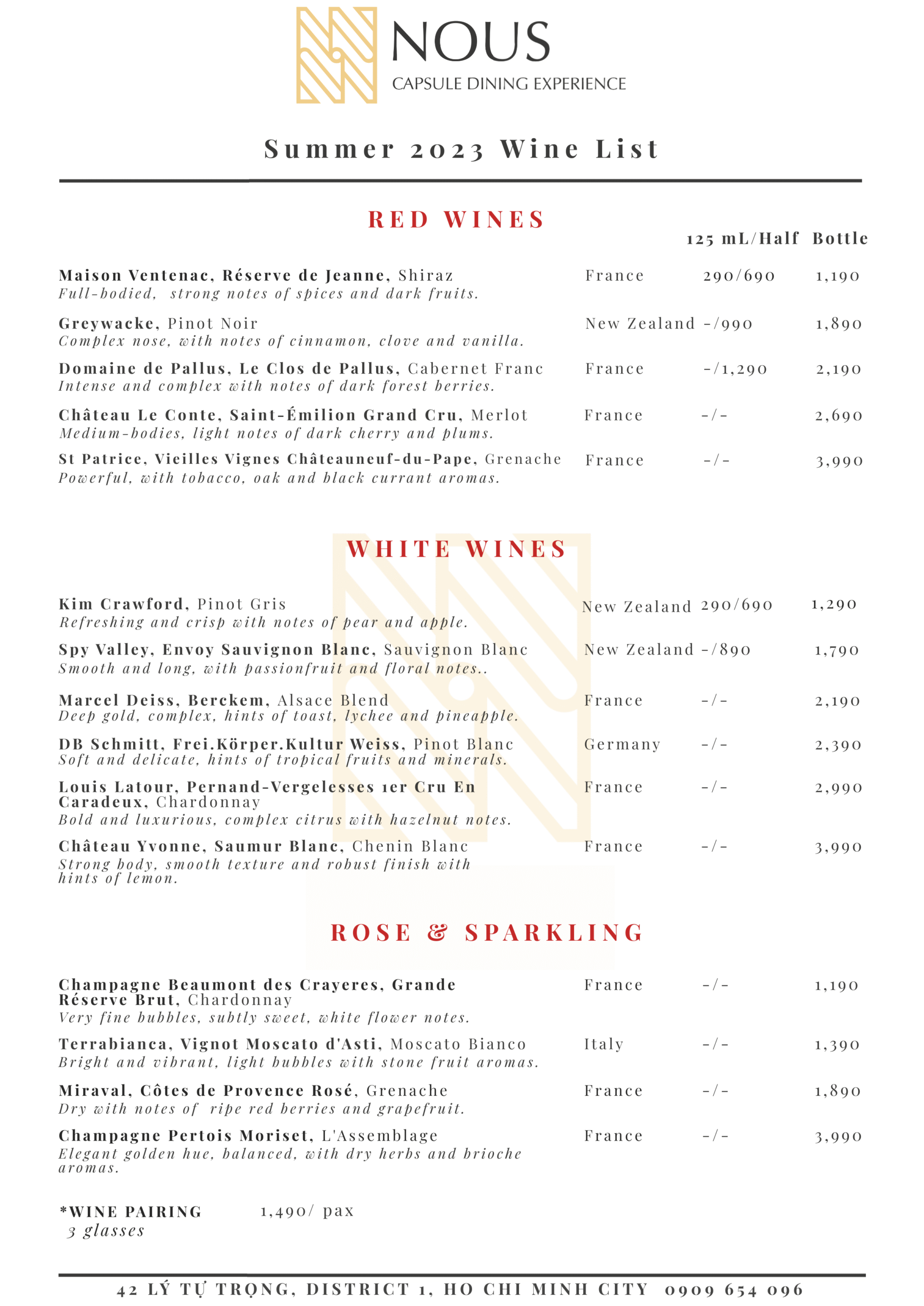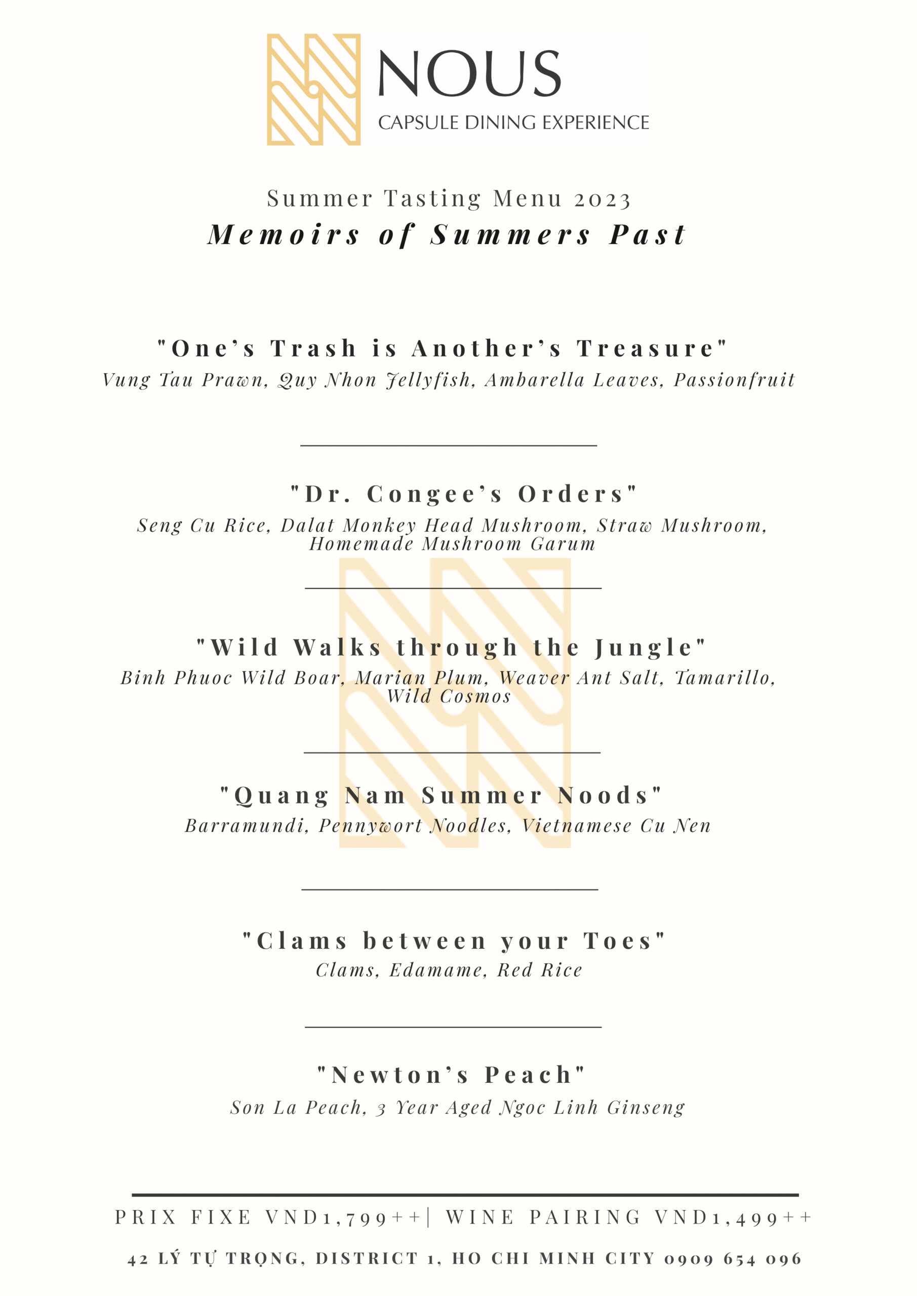 At Nous, innovation and creativity are at the heart of their culinary philosophy. To keep the experience fresh and exciting, they introduce a new menu every three months. This regular rotation allows them to showcase their versatility and adaptability in creating exceptional dishes that reflect the current season and culinary trends. By periodically reinventing their menu, they ensure that their guests are always treated to a novel and engaging gastronomic adventure. Their talented team of chefs is dedicated to crafting dishes that marry the best of local flavors with contemporary techniques, presenting a harmonious blend that delights the senses and leaves a lasting impression on their patrons. Whether you are a local or a traveler seeking an extraordinary dining experience, Nous invites you to embark on a culinary exploration like no other.